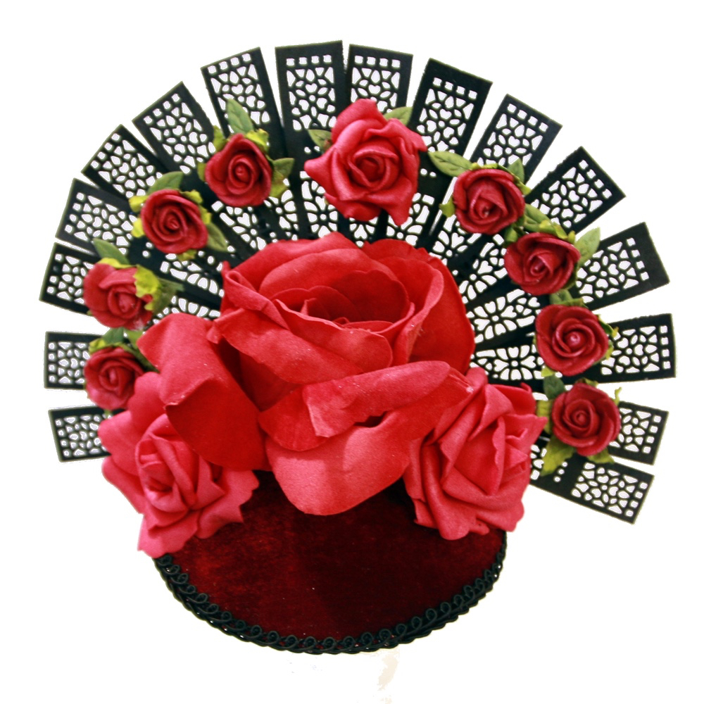 Rot-Schwarzer Fascinator mit asiatischem Fächer und Rosen