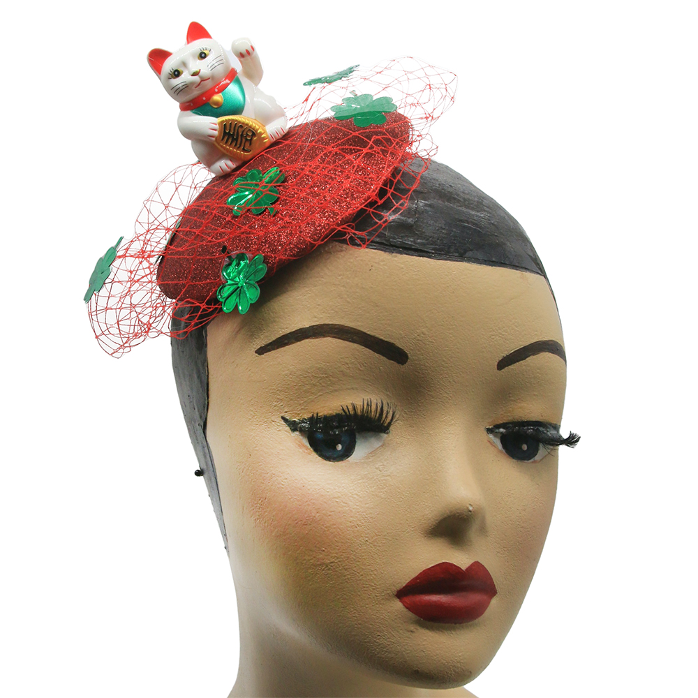 Roter Fascinator mit Winkekatze und Kleeblättern
